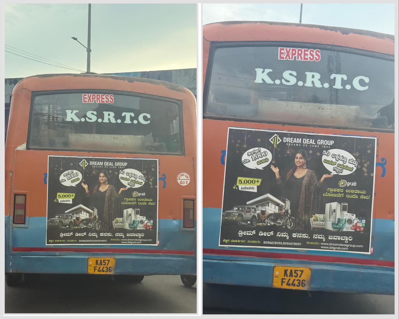 ಡ್ರೀಮ್ ಡೀಲ್ ಮೂಲಕ ನಿಮ್ಮ ಕನಸು ನನಸಾಗಿಸಿಕೊಳ್ಳಿ.. ತಿಂಗಳಿಗೆ ಒಂದು ಸಾವಿರ ಉಳಿಸಿ, 50 ಲಕ್ಷಕ್ಕೂ ಹೆಚ್ಚು ಮೌಲ್ಯದ ಬಹುಮಾನ ಗೆಲ್ಲಿರಿ.. ಡ್ರೀಮ್ ಡೀಲ್ ಉಳಿತಾಯ ಯೋಜನೆಗೆ ಇಂದೇ ಸೇರಿ.. ಡ್ರೀಮ್ ಡೀಲ್ ನಿಮ್ಮ ಕನಸು ನಮ್ಮ ಜವಾಬ್ದಾರಿ ಎಂದು ಬರೆದಿರುವ ಜಾಹೀರಾತನ್ನು ಮಂಗಳೂರಿನಿಂದ ಪುತ್ತೂರು, ಬೆಳ್ತಂಗಡಿಗೆ ತೆರಳುವ ಹಲವು ಕೆಎಸ್ಸಾರ್ಟಿಸಿ ಬಸ್ಸುಗಳಲ್ಲಿ ನೀಡಲಾಗಿದೆ. ಖ್ಯಾತ ನಿರೂಪಕಿ ಅನುಶ್ರೀ ಅವರ ಫೋಟೋವನ್ನು ಜಾಹೀರಾತಿಗೆ ಬಳಸಿಕೊಳ್ಳಲಾಗಿದೆ.