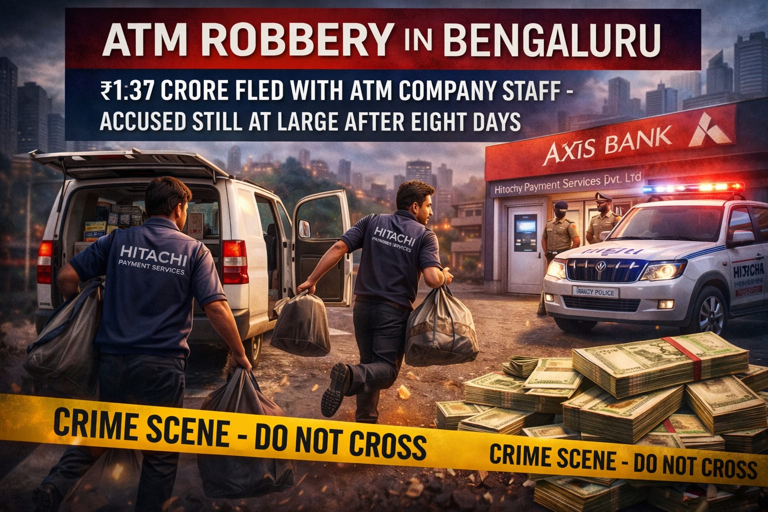 In a fresh robbery case in Bengaluru, employees of Hitachi Payment Services allegedly escaped with ₹1.37 crore meant for ATM cash loading. Two separate teams misappropriated ₹50 lakh and ₹80 lakh respectively. FIRs have been registered at Koramangala police station, but even after eight days, the accused remain at large as police continue the investigation.