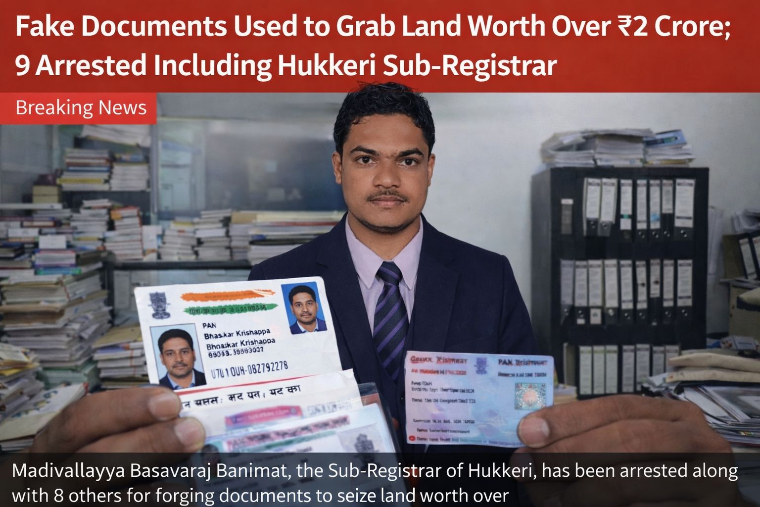 Belagavi police have arrested nine accused, including Hukkeri Sub-Registrar Madivallayya Basavaraj Banamath, for allegedly creating forged documents to illegally acquire land worth over ₹2 crore. The accused reportedly fabricated fake Aadhaar, PAN, and voter ID cards, posing as both buyers and sellers to register the property at the sub-registrar’s office.