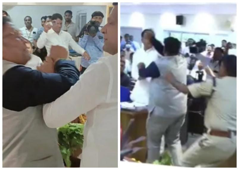 A quarterly KDP review meeting at the District Panchayat office turned chaotic when BJP MLA Dr. Siddalingappa Patil and Congress MLC Bhimrao Patil engaged in a heated verbal exchange that escalated into a physical scuffle.