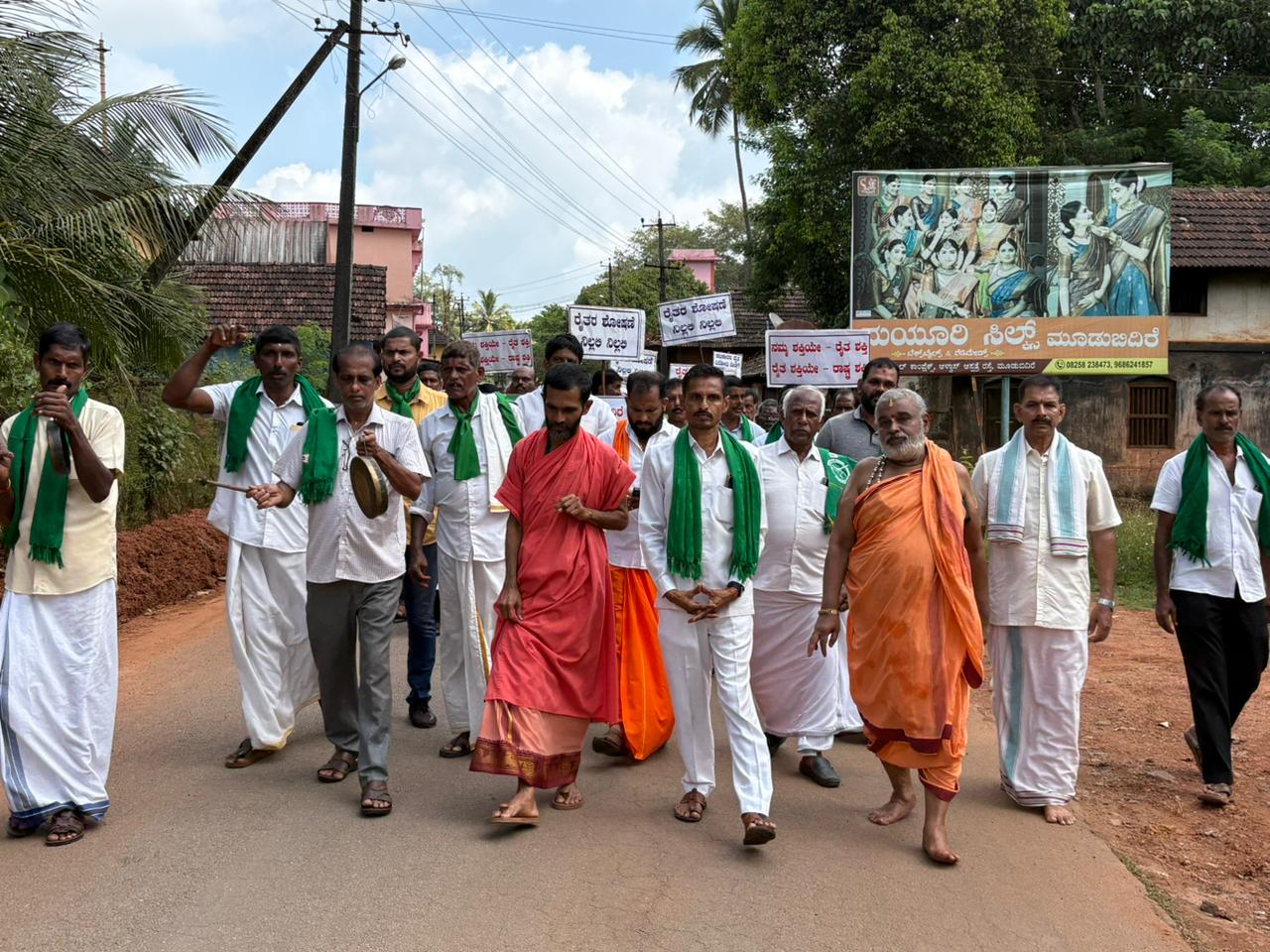 A large group of farmers staged a protest at Ashwatthapura near Moodbidri on Saturday against the Udupi–Kasaragod 440 kV power line project, accusing the Star Light Power Company of destroying agricultural lands and using police force to suppress farmers’ voices.