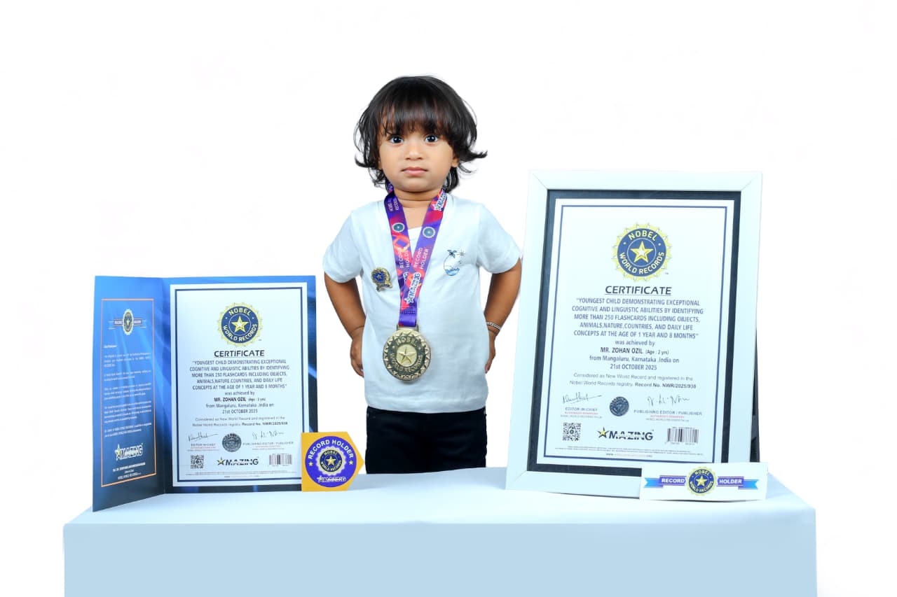 A remarkable child prodigy from Mangaluru, 1-year-8-month-old Johan Ozil, has achieved global recognition by entering the International Book of Records for his extraordinary abilities at such a tender age. Demonstrating skills far beyond his years, Johan has identified over 200 different objects, including names of countries, fruits, colours, vehicles, and more, earning him multiple record titles.