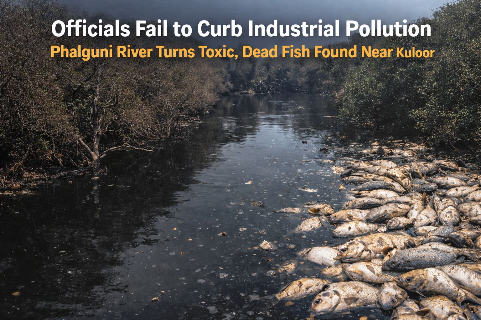 Severe pollution has turned the Phalguni River near Kuloor completely black, with foul smell and heaps of dead fish alarming locals. Residents allege that untreated industrial waste from Baikampady units and MRPL is being discharged into the river, worsened by blocked water flow due to bridge construction. Despite repeated complaints, officials are accused of negligence as pollution continues to threaten aquatic life and the livelihoods of fishermen.
