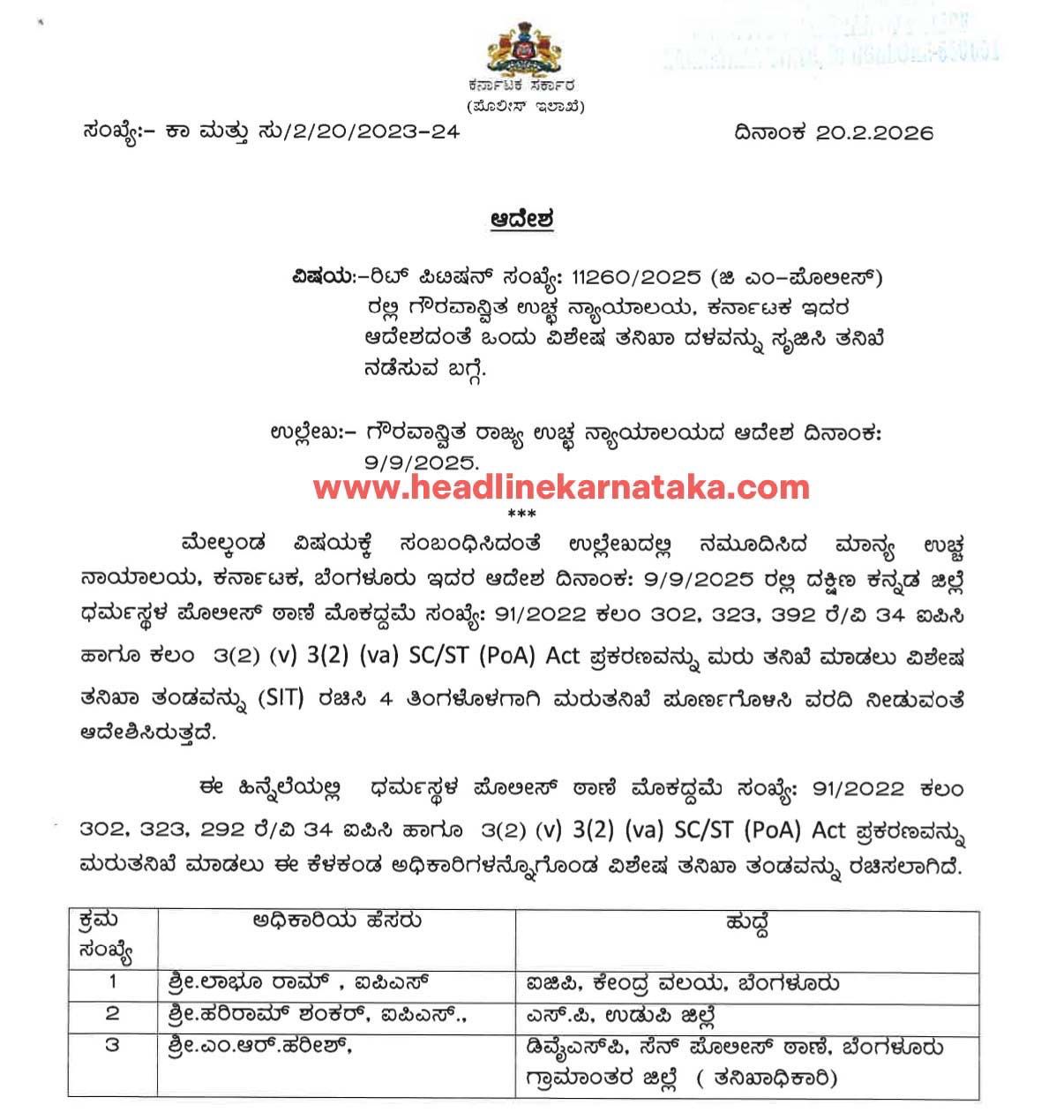 ಹೈಕೋರ್ಟ್ ಸೂಚನೆಯಂತೆ ಇದೀ ರಾಜ್ಯ ಡಿಜಿಪಿ ಡಾ.ಎಂ.ಎ. ಸಲೀಂ ಅವರು ಐಜಿಪಿ ಲಾಬೂರಾಮ್ ನೇತೃತ್ವದಲ್ಲಿ ವಿಶೇಷ ತನಿಖಾ ತಂಡ ರಚಿಸಿದ್ದಾರೆ. ಇದರಲ್ಲಿ ಹಾಲಿ ಉಡುಪಿ ಎಸ್ಪಿ ಆಗಿರುವ ಹರಿರಾಮ್ ಶಂಕರ್ ಮತ್ತು ಬೆಂಗಳೂರು ಸೆನ್ ಪೊಲೀಸ್ ಠಾಣೆಯಲ್ಲಿ ಡಿವೈಎಸ್ಪಿಯಾಗಿರುವ ಎಂ.ಆರ್ ಹರೀಶ್ ಅವರನ್ನು ತಂಡದಲ್ಲಿ ಸೇರಿಸಲಾಗಿದೆ.