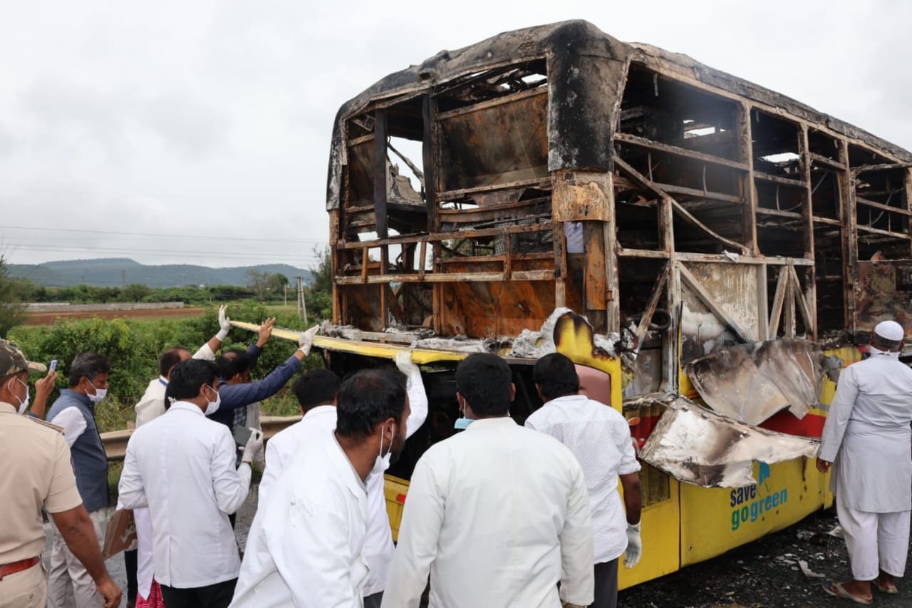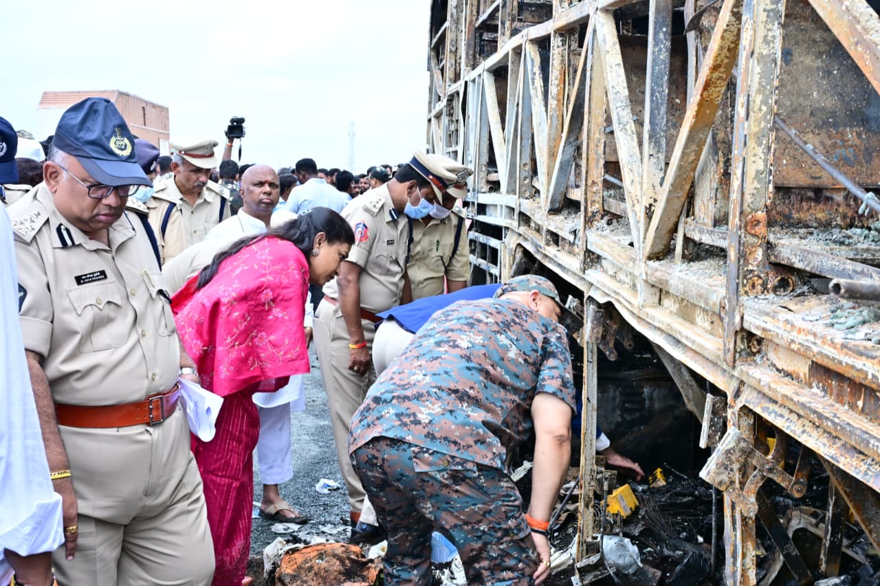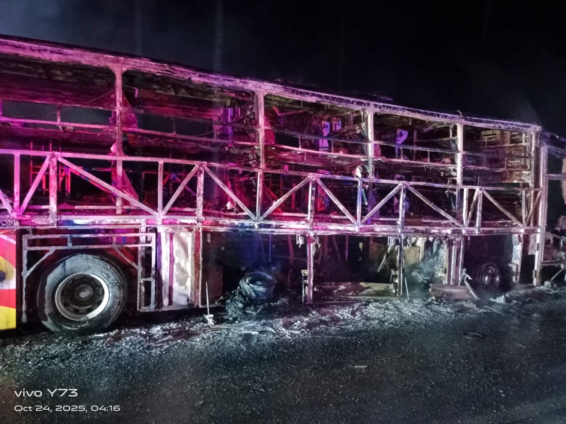 In a horrific accident near Chinna Tekuru on the outskirts of Kurnool, Andhra Pradesh, at around 3:30 AM on Friday, a private sleeper bus traveling from Hyderabad to Bengaluru caught fire after colliding with a motorcycle. The blaze engulfed the vehicle within moments, killing at least 20 passengers, including children and elderly people, who were asleep at the time.