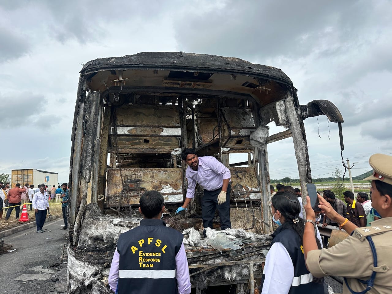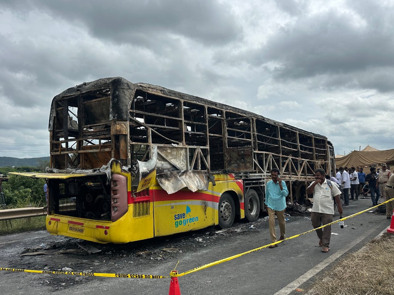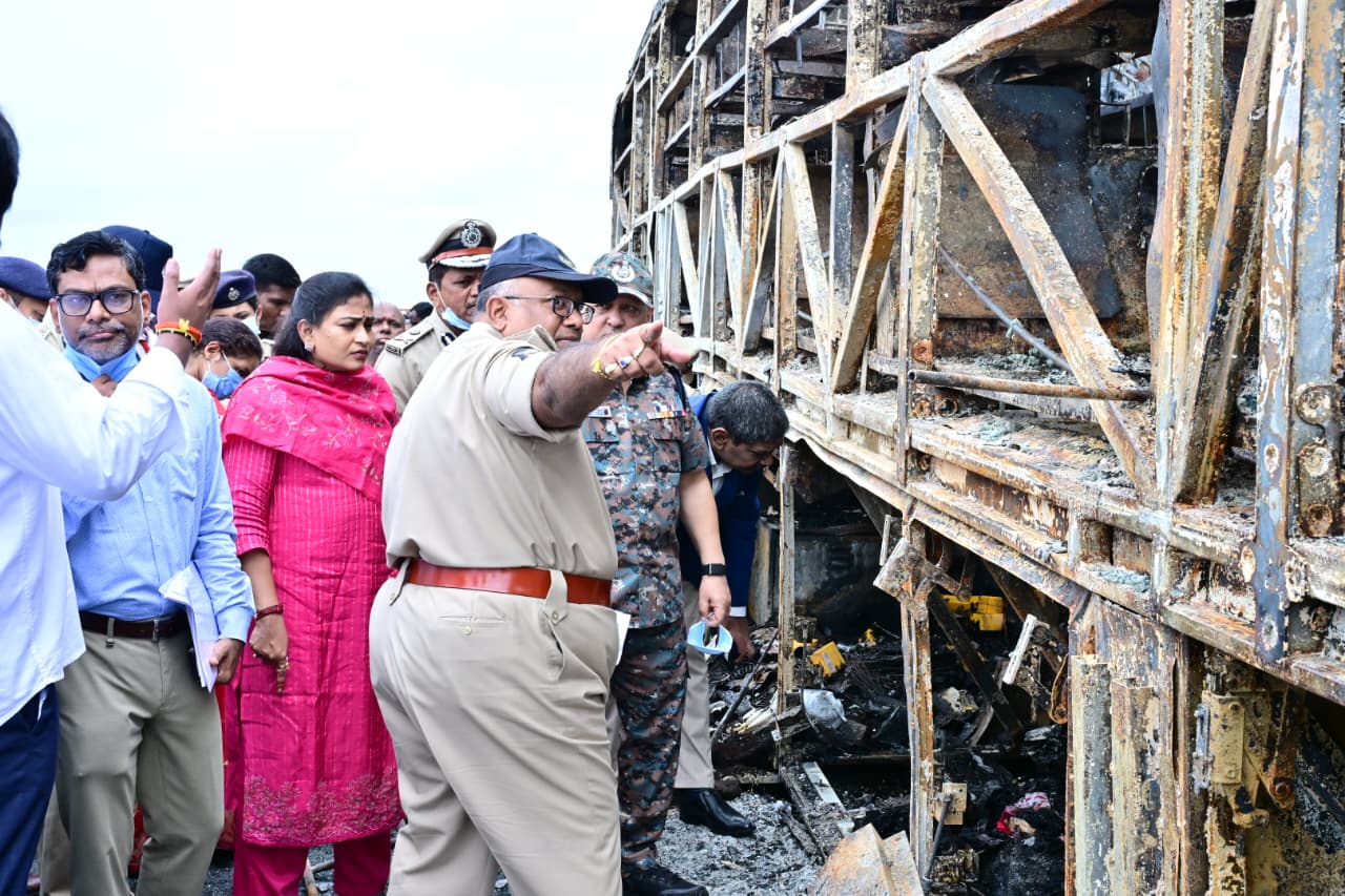 In a horrific accident near Chinna Tekuru on the outskirts of Kurnool, Andhra Pradesh, at around 3:30 AM on Friday, a private sleeper bus traveling from Hyderabad to Bengaluru caught fire after colliding with a motorcycle. The blaze engulfed the vehicle within moments, killing at least 20 passengers, including children and elderly people, who were asleep at the time.